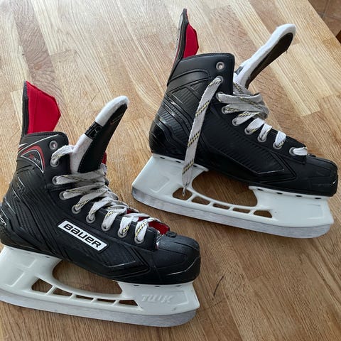 Säljer ett par Bauer skridskor i strl 45,5. Har använts sparsamt under några år för att sällskapa barn på is. Fint skick men kan behöva slipas. Skickar med skydden.
