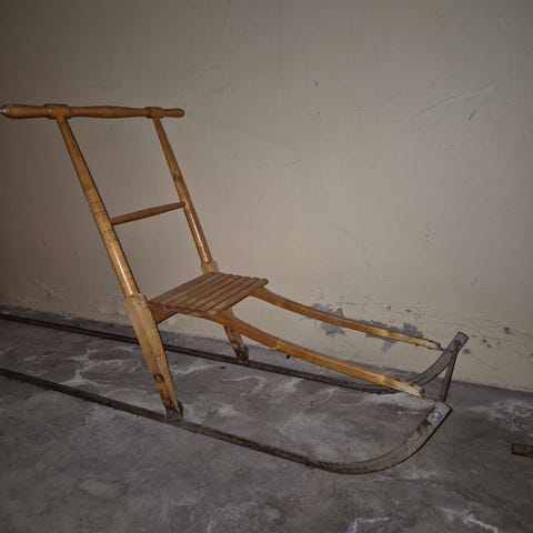 Spark från Vansbro. Ihopfällbar mha två vingmuttrar. Lackavskrap på sitsen som det brukar bli. Lite använd. Förvarats inomhus mestadels av tiden. 92 cm hög, upp till handtaget. Nypris 1595 kr.