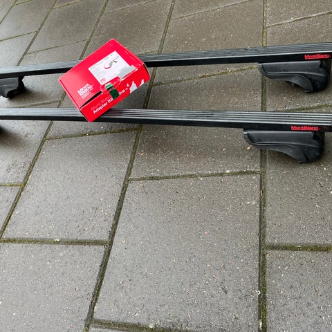 Takräcke och två cykelhållare för bilar med öppna rails. Jag har använt takräcket på en Saab 9-5 och en VW Tiguan 2013, båda bilar med rails på taket. Takräcket är 128cm långt. Både takräcke och cykelhållare är av fabrikat Thule.