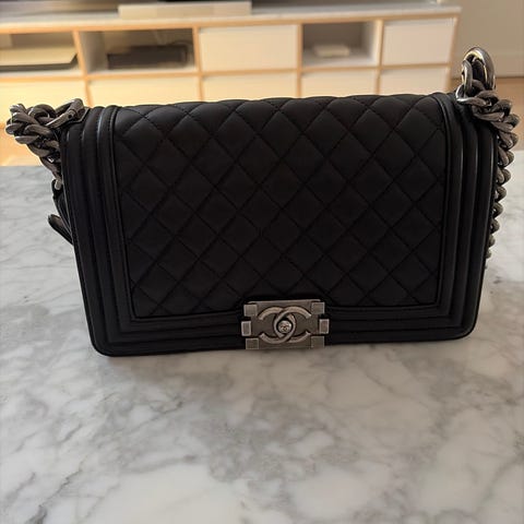 Chanel Boy Bag väska i caviarläder med guldtornad hårdvara. Väskan har en quiltad design och en kedjerem med läderdetaljer. Den har en låsbar klaff och en mjuk, strukturerad form.