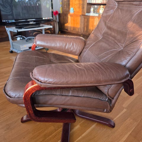 Fotölj -stresslessmodell med fotpall i svart läder och träram