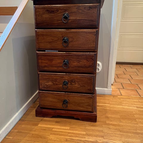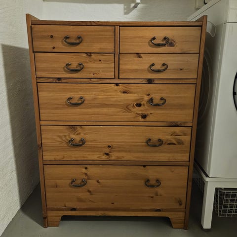 IKEA byrå i trä med fem lådor. Möbeln har en smal och hög design med en öppen hylla överst. Passar för förvaring i olika rum.