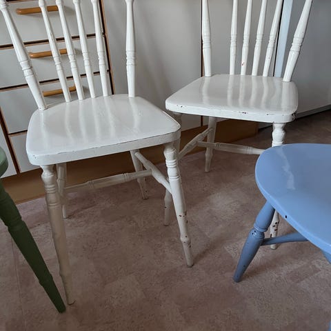 Säljer två äldre pinnstolar. Fina stolar i behov av ommålning.