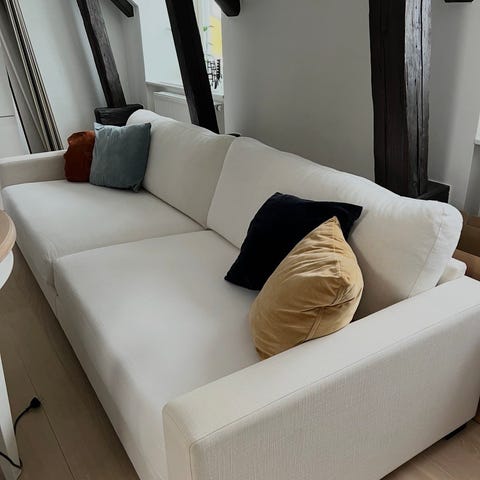 Alltid haft skyddande filtar ovanpå. Möjligen någon liten fläck som inte märks tydligt. Avtagbart och tvättbart tyg i båda utföranden.