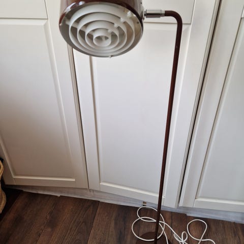 Elegant och tidstypisk golvlampa i mässing, tillverkad av OMI Armaturer AB (Sverige) under 1960-talet. Lampan har ett justerbart klotformat lamphus med original aluminiumreflektor som ger ett behagligt och riktat ljus – perfekt som läslampa eller stämningsbelysning.