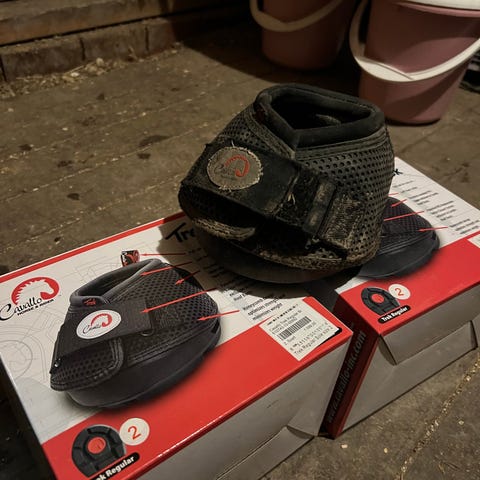 Ena skon använd vid två tillfällen på vintern, den andra oanvänd storlek 6 med dubb.