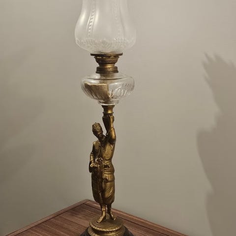 Fotogenlampa Kandelaber med sex ljushållare. Tillverkad i mässing med glasdetaljer. Passar som taklampa i hemmet. Ombyggd för el