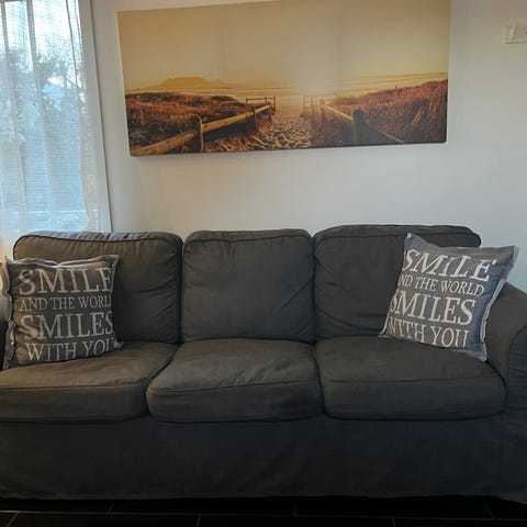 Skön soffa, säljes då den är för stor i utrymmet. Ett skadat hörn sedan tidigare, men det är inget som märks med klädseln på. Finns hund i hemmet och hämtas i Skyllberg. Isärplockad så det är bara att bära. Klädseln är nytvättad men då jag har hund kan hår förekomma ändå. Klädseln går självklart att tvätta sen också.