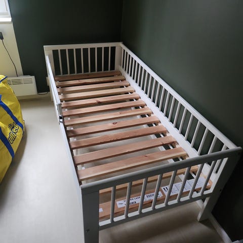 Säng från jollyroom som är sparsamt använd, lite märken på ena sidan efter ett sidoskydd.