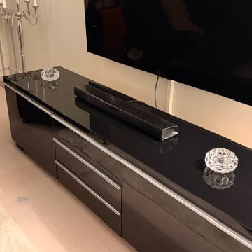 IKEA TV-bänk i grå färg med två glasdörrar och förvaringsutrymme. Möbeln är anpassad för att hålla TV och annan mediautrustning samt förvaring av tillbehör.