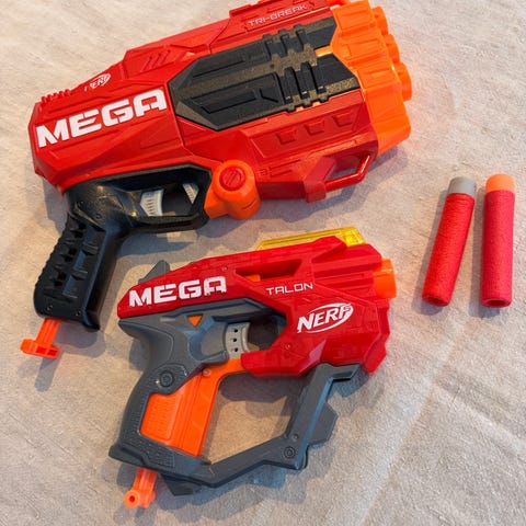 X-Shot och Nerf Dart Blaster Set med 6 mjuka pilar. Setet innehåller tre olika blasters i färgerna blå, röd och vit, designade för lek och dartskjutning.