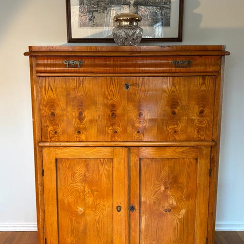 Antik sekretär tillverkad i trä med glasdörrar och flera lådor för förvaring. Möbeln har en nedfällbar skrivskiva och hyllor bakom glasdörrarna. Passar för förvaring och skrivarbete i hem eller kontor.
