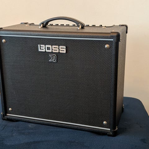 Boss Katana 50 generation 3, gitarrtillbehör med inbyggd förstärkare och kontrollpanel. Utrustad med flera reglage för justering av ljud, inklusive gain, volym och equalizer. Har anslutningar för AUX, hörlurar och Bluetooth-stöd. Designad för användning med elgitarrer. Den har bara används vid ett bröllop och sedan stått hemma. Har köpt till bluetooth modul som gör att den spelar upp musik m m från till exempel telefon. Nypris ligger runt 3600kr för denna uppsättning.