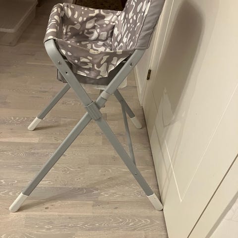 Jollyroom barnstol med tygklädsel och bärbar design som fästs på bord. Passar för barn och kan användas för måltider eller lek vid bordet.