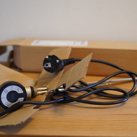 Produkten inkluderar mätare, anslutningsinstruktioner, en resistor och kablage. Används för att mäta vattentemperatur i olika system.