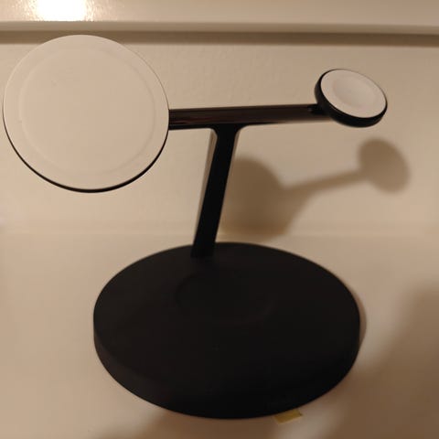 Stilren laddare som laddar tre apparater samtidigt, t.ex en iPhone, ArPods och en Apple Watch.