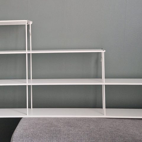 Gatsby är en vägghylla i lackerad metall med skön balans mellan runt och kantigt.