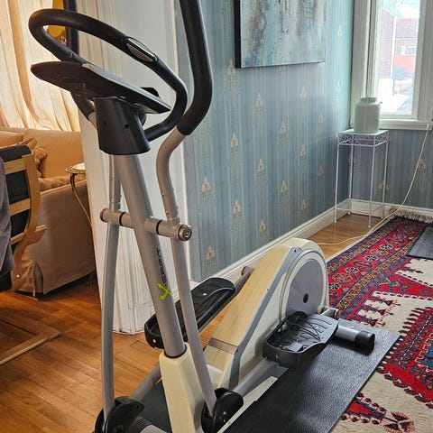 ProShape Crosstrainer träningsmaskin i svart och grå färg. Maskinen är avsedd för konditionsträning och har ett digitalt display för att följa träningsdata. Passar för hemmabruk.