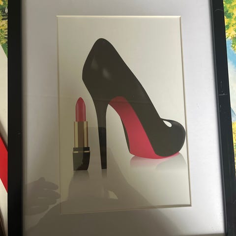 IKEA dekoration med motiv som visar en sko och texten "Shoes are like Chocolate there's always ROOM FOR MORE". Produkten är fyrkantig och har en svart ram.