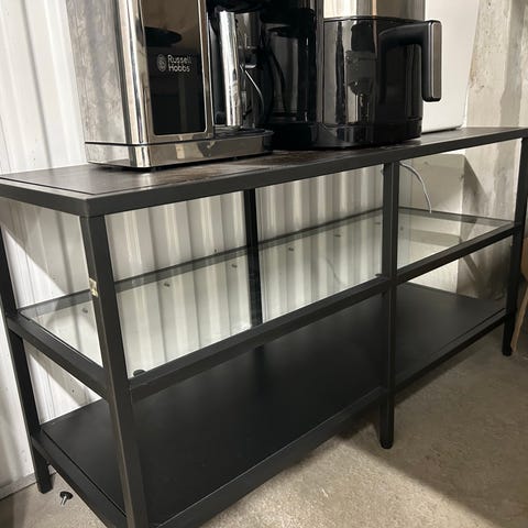 Svart tv bänk från IKEA. Ramen är svart metall, övre och nedre hyllan är trä och mitten hyllan är glas.
