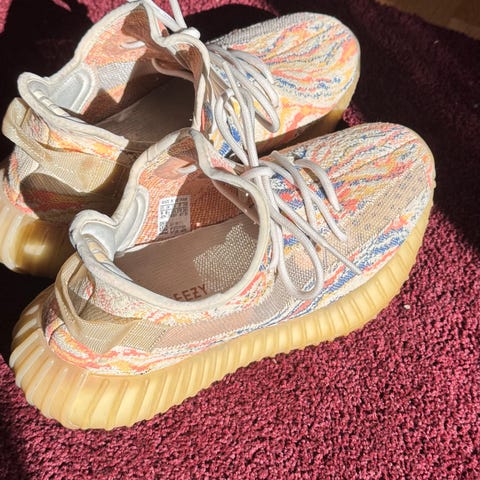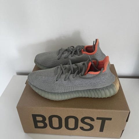 Yeezy Sneakers i storlek 43 Skorna har en design med en tydlig orange detalj längs sidan och är tillverkade med en kombination av material som ger både komfort och stil.