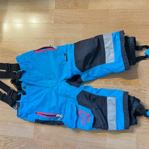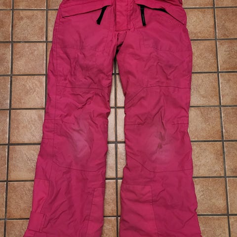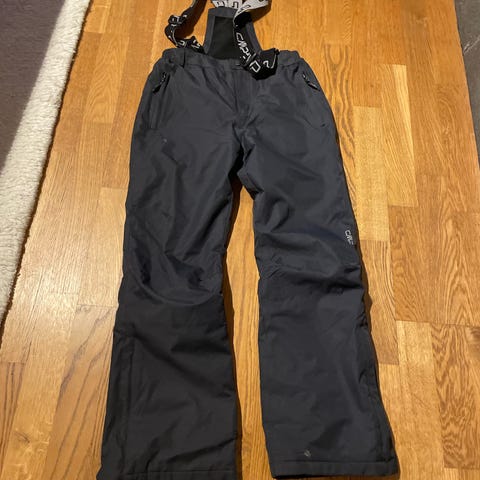 Svart/gråa överdragsbyxor som har spruckit lite där bak, kan lagas m symaskin alt en reparationslapp. Bra vattentäta skidbyxor. Stl 130.