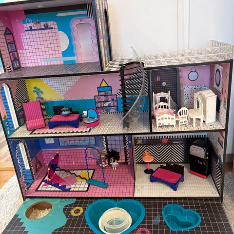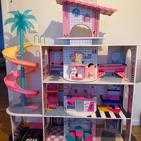 L.O.L. Surprise dockhus med två våningar och olika rum. Inkluderar inredning samt flera L.O.L. dockor och olika tillbehör.