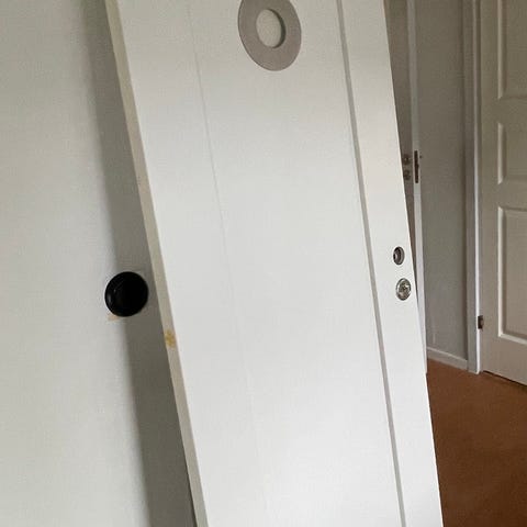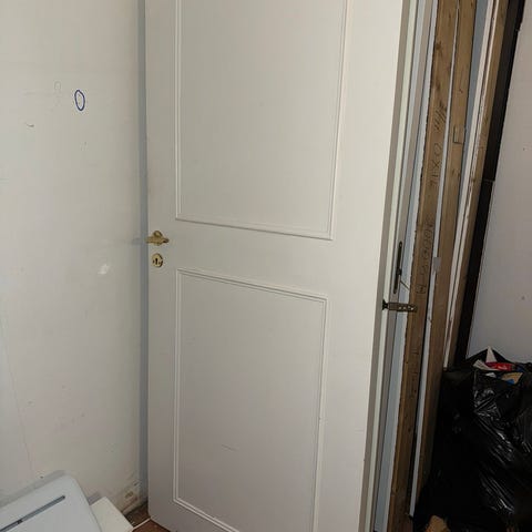 Innerdörr i färgen ek med kromade dörrhandtag och lås. Endast dörrbladet! Karm och lister ingår inte. Fint använt skick, inga större hack eller sprickor.