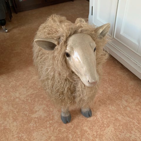 Svart fårfigur tillverkad i pälsmaterial med detaljer i svart plast. Figuren är utformad som ett får med lockigt pälsliknande yta och har en realistisk form med öron och ben. Kan användas som dekorationsobjekt i hemmet eller som en unik inredningsdetalj.