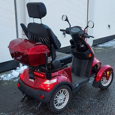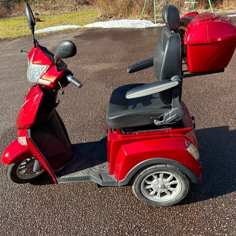 Trehjulig promenadskoter med förvaringslåda bak. Skotern har speglar på båda sidor och en framlykta. Användbar för personer med behov av mobilitets hjälp. Observera att det finns mindre repor och märken på karossen.