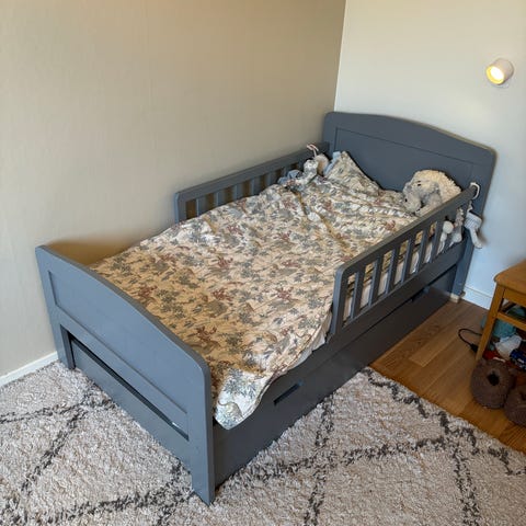 JLY Juniorsäng i grå färg. Sängen är avsedd för barn och har en robust träkonstruktion. Passar för användning som övergångssäng för barn som växer ur spjälsäng.