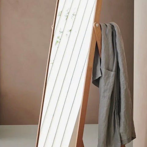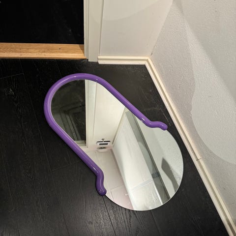 IKEA spegel med golvmodell och svart ram. Spegeln är avsedd att stå på golvet och har en enkel design med svart kant.