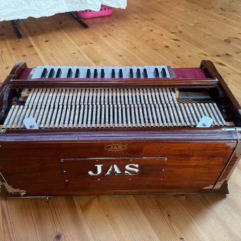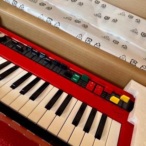 Inklusive benställning, volympedal och lock. Allt funkar men synth-delen behöver en genomgång. Drar man på ett synthljud så låter det konstant, touch-stripen ändrar ton men ljudet låter hela tiden.