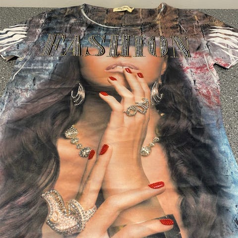 En läcker T-Shirt från Desigual som inte är använd. Storlek enligt etiketten är Euro XXL. Den kan snöras åt ner till där texten är. Den är svart med läckra röda o rosa färger