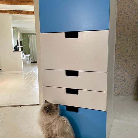 IKEA barnmöbler i blå färg bestående av en byrå med två lådor och ett skåp med två dörrar. Möbelserien är anpassad för barnrum och erbjuder förvaringslösningar.