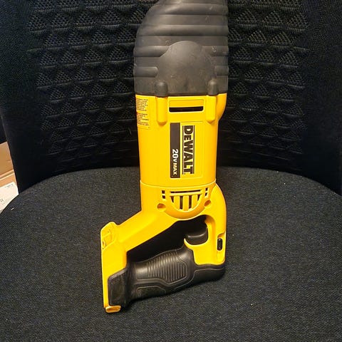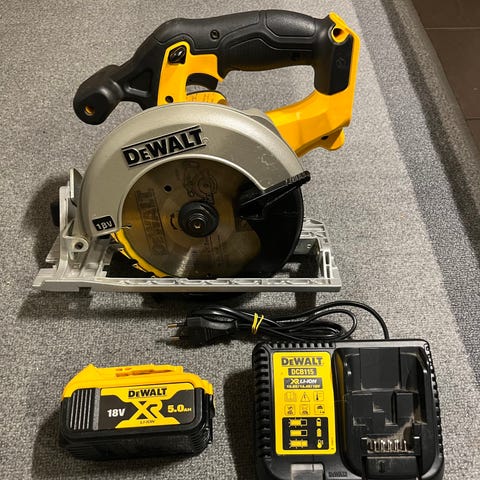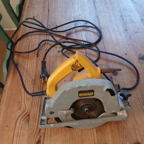 DeWalt Cirkelsåg i gul och svart färg. Verktyget är avsett för sågning och har en ergonomisk design med handtag för bättre grepp. Batteri ingår inte.