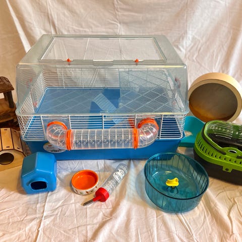 Hamsterbur tillbehör ingår såsom tunnel, hjul, hus, vattenflaska mm. Två våningar använd till en guldhamster.