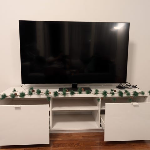 Snygg och praktisk tv-möbel med lådor och hylla. Tyckte möbeln blev snyggare utan metallhandtagen som finns på Ikeas bild, så de monterade vi aldrig på och de medföljer inte. Den är i toppenskick.
