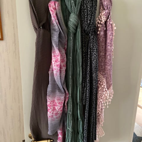Säljer fem halsdukar i olika storlekar. Tre halsdukar i storlek 86 x 86 cm och två är lite större - 115 x 159 cm