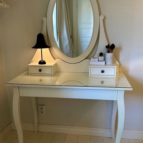 Det finns gott om plats för smink och smycken i de två små lådorna och den stora dolda lådan under toalettbordet.