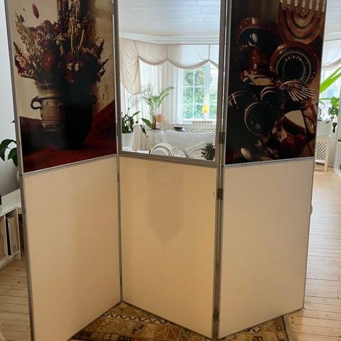 2 x 4 skärmdelar med stålram 103 x 73 cm med fasta pappskivor 98 x 69 cm. Finns lite märken på pappskivorna sedan tidigare utställningar. Skärmarna fälls upp och låses.