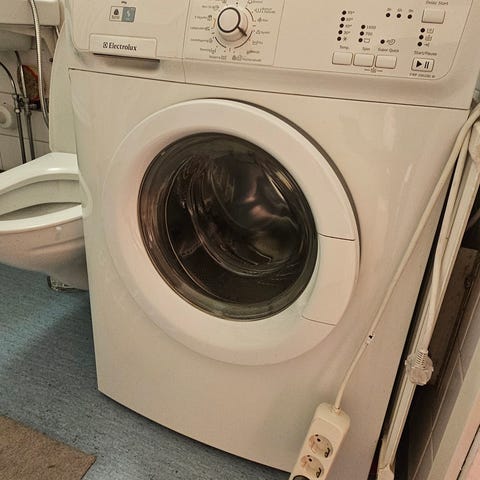 Toppmatad tvättmaskin med enkel design och två vred för inställningar. Maskinen har en vit och brun färgkombination och en avtagbar tvättkorg. Passar för mindre tvättmängder och är avsedd för hembruk. Hämtas hos oss. Nypris 1000 kr.