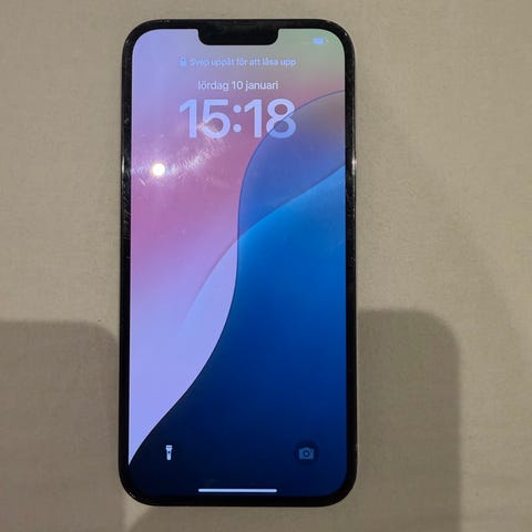 Apple iPhone 13 Pro Max 128 GB lagringskapacitet och orginalkartong. Enheten har en skärm med hög upplösning och tre kameror på baksidan för fotografering i olika ljusförhållanden. Designad med rostfritt stål och glas. Färg: guld kant och pärlvit på baksidan. iPhone kallar denna färg guld. Den är varsamt använde och inga sprickor eller tydliga repor, batterihäsan är 80%.