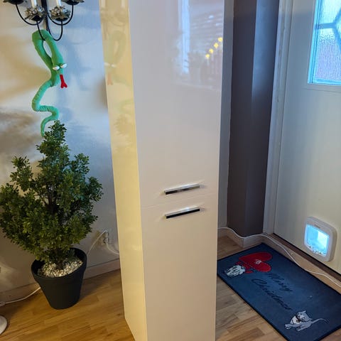 Vit högskåp för badrum med flera hyllplan. Skåpet är smalt och högt, lämpligt för förvaring av badrumsartiklar och andra mindre föremål. Skåpet har en dörr med handtag och är anpassat för att stå på golvet i badrumsmiljö.