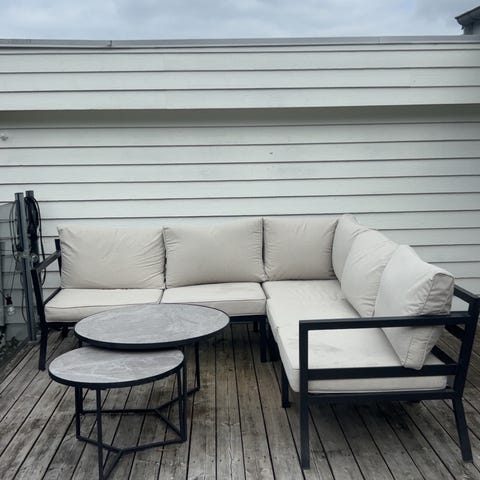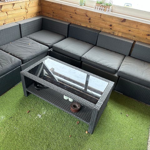 Utemöbelset hörnsoffa och bord grå konstrotting