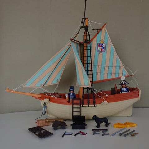 Playmobil skepp och Borg. Några delar saknas, t.ex. så kan man ej fästa det främre och aktre seglet på skeppet om man inte limmar. Finns nermonterat i Älvsjö. Skickas ej.