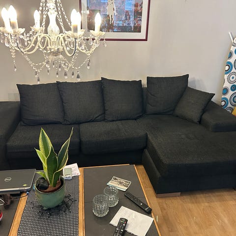 Grå hörnsoffa i tyg med divan