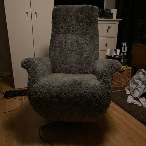 DUX, fåtölj, design Kenneth Bergenblad, klädd i grått skinn, snurrbar, fot i metall.