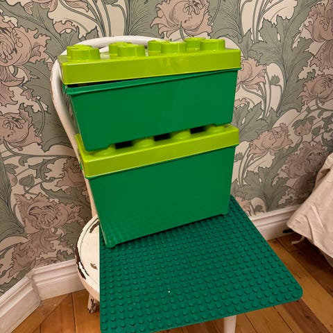 Några med bokstäver och siffror. Några i lite rosa toner som man kan bygga ett cafe med. Några figurer. Några man kan göra flygplats med. Grön platta medföljer.