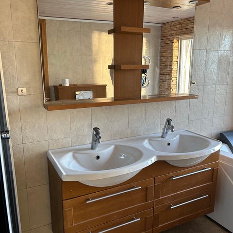 Tvättställsskåp med handfat och kran FM Mattsson. Skåpet har två dörrar med förvaringsutrymme inuti. 55 cm brett. 45 cm djupt. Hämtas på Öster i Växjö under v 3.
